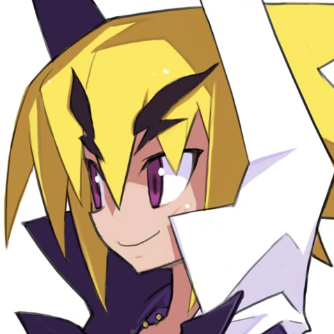 Axel is a demon that has a human-like appearance with a thin, yet athletic build. He has shoulder-length blond hair that spikes out in the back of his head. He has thick purple eyebrows, which are in the style of lightning bolts, that overlaps with his hair. He has purple eyes (and like most humanoid demons in Disgaea) he has pointed ears, a small nose and his teeth have fangs. His clothing consists of an open, long-sleeved, white coat with a purple inner lining and pairs of purple studs going down his outer sleeves; separated by a lighter purple slit just after his shoulders. His coat also has an outrageously high collar, that reaches up about two times the height of his head, with coattails that flow down to his feet, both of which end in rounded points. Axel does not wear a shirt underneath his coat; exposing the entire front of his torso, from his chest to his waist, with his bellybutton visible. He wears a white belt with a black buckle over skinny purple pants, that are seemingly too long for him as they bunch up over his shoes. He has on white and shiny shoes with no laces and thick purple soles that get thicker at the heels. Axel also wears a few different accessories such as: a purple chain around each wrist, over his sleeves, similar to a bracelet. In his left ear are two simple, circle, purple earrings. Lastly, a gold chained necklace with a golden medallion, inscribed with a capital A, that hangs to his chest.