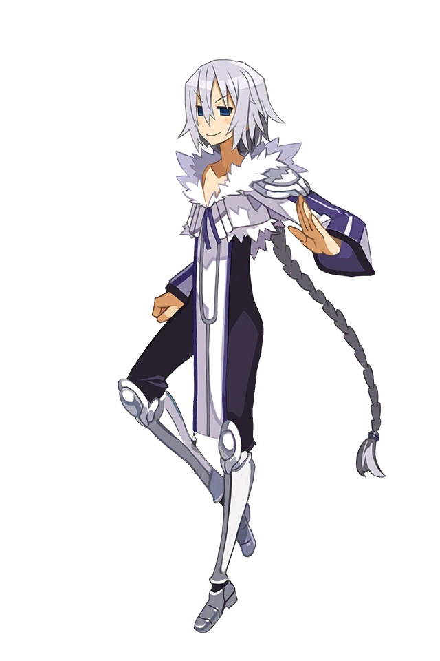 Virunga is a recolour of the Male Angel class. He wears their standard uniform, which consists of a low-cut feathered shirt, shoulder pauldrons, a long, white chest cloth that hangs down to his knees, a black bodysuit, and armoured boots. Where the standard Male Angel's upper outfit has teal accents, Virunga's are dark purple. His hair is silver, and is in the same long, braided hairstyle as the generic Male Angel. His eyes are also a slightly darker blue than the generic. He is implied to be exceptionally good-looking for an angel, with Etna referring to him as "as handsome as the last Archangel wasn't," and one of his class titles in Disgaea RPG being "Beautiful Archangel."